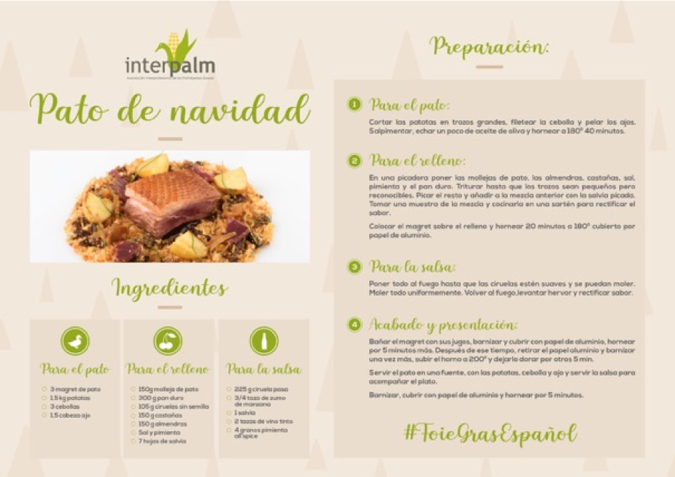 «Interpalm os desea unas felices fiestas que, a pesar de la distancia que nos pueda separar de nuestros seres queridos, debemos hacer que sean lo más especiales posibles. Por ello y para alegrar estas Navidades os proponemos una exquisita receta de pato para seis comensales. ¡Feliz Navidad y próspero 2021!».