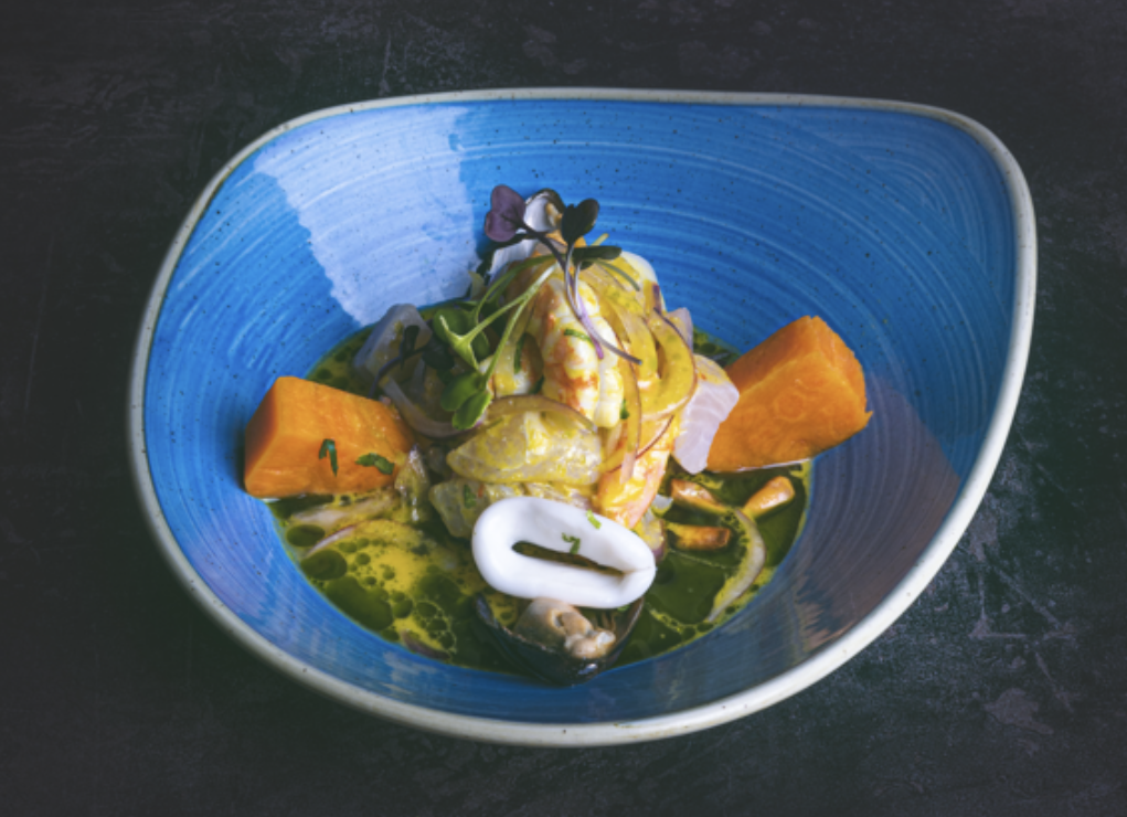 Pescado fresco marinado en jugo de limón, acompañado de cebolla roja, cilantro y ají limo, complementado con crujientes calamares.