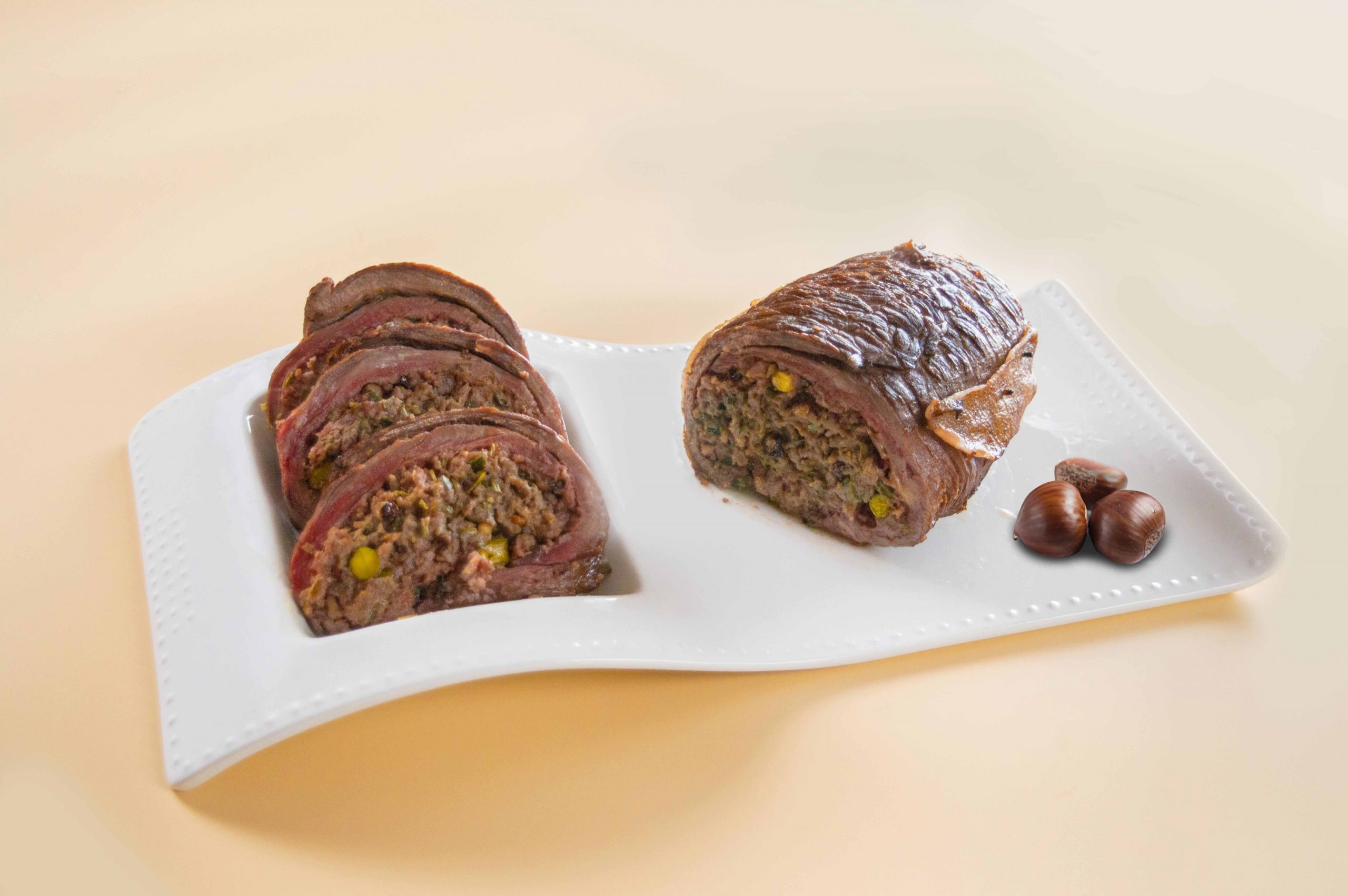 - Solomillos de cerdo marinados relleno de queso y nueces, paté, boletus, manzana y almendras.